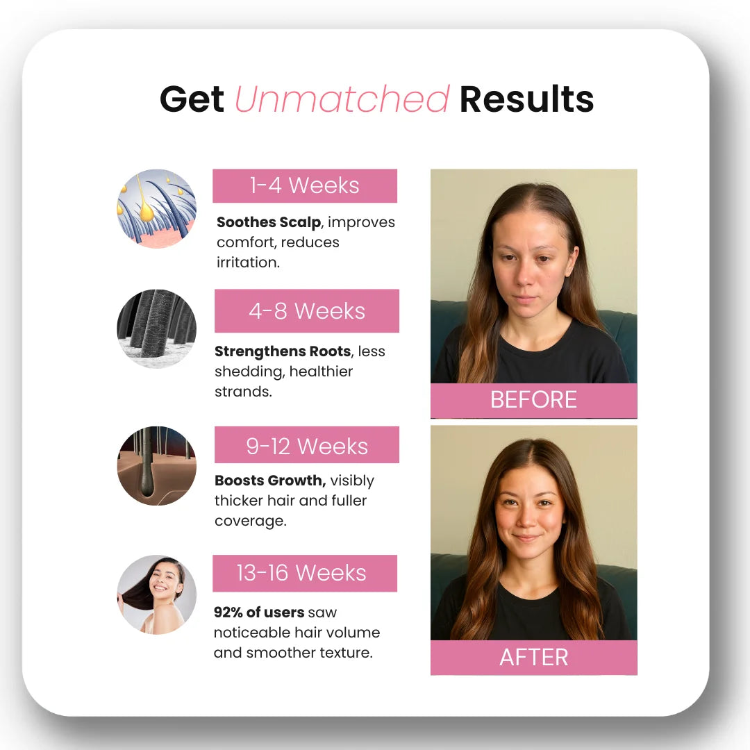 - Beugt Haarausfall vor – Heilt geschädigte Kopfhaut, kahle Stellen und dünner werdendes Haar für langfristige Ergebnisse.