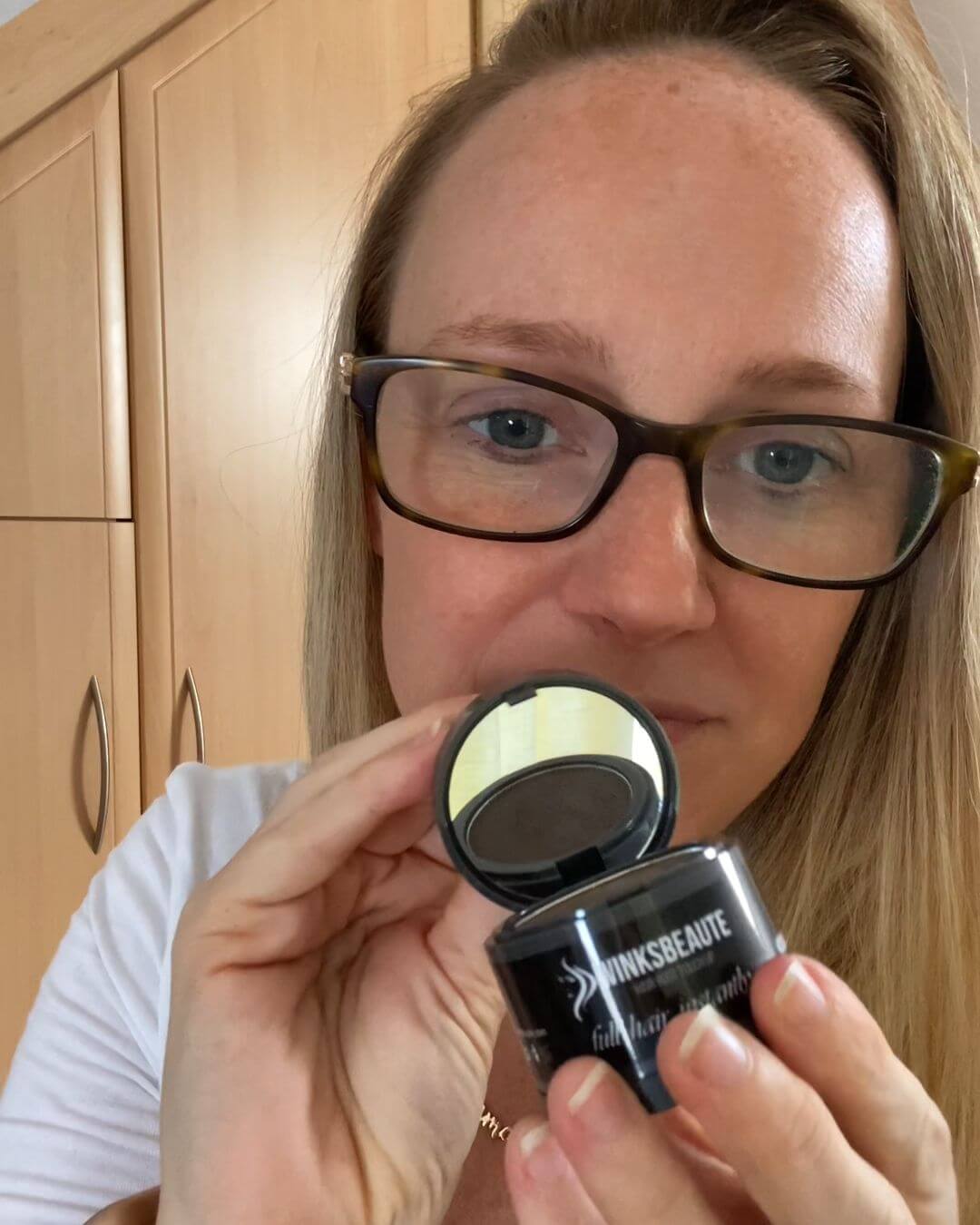 - With the Puff: Dab the puff onto your scalp and thinning areas. Press and roll the puff to release the product evenly across your hair roots.
