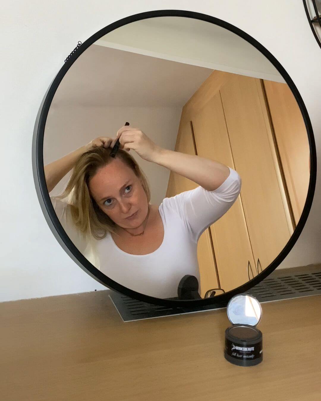 Use your fingertips or a comb to gently blend the concealer into your hair, creating a natural look. If desired, you can apply a light hairspray to set the concealer for longer-lasting hold throughout the day.